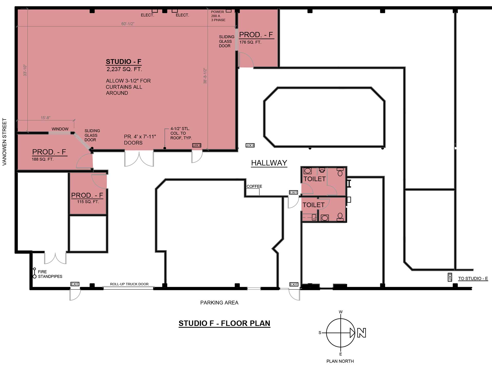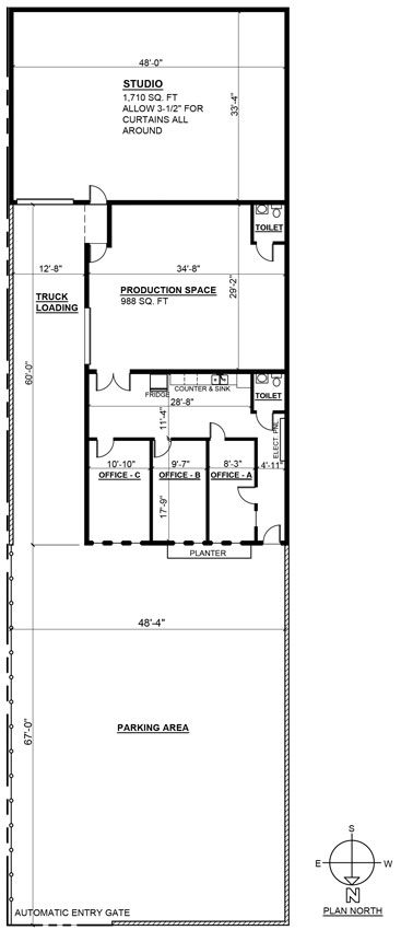 Boasting 1 large studio, a 2nd studio / auxillary space, kitchenette, 2 restrooms, 3 production office suites, gated parking for 9 cars, semi-truck load-in access, 3 phase cam lock tie in power, and high speed dedicated fiber hardwired and wireless internet.